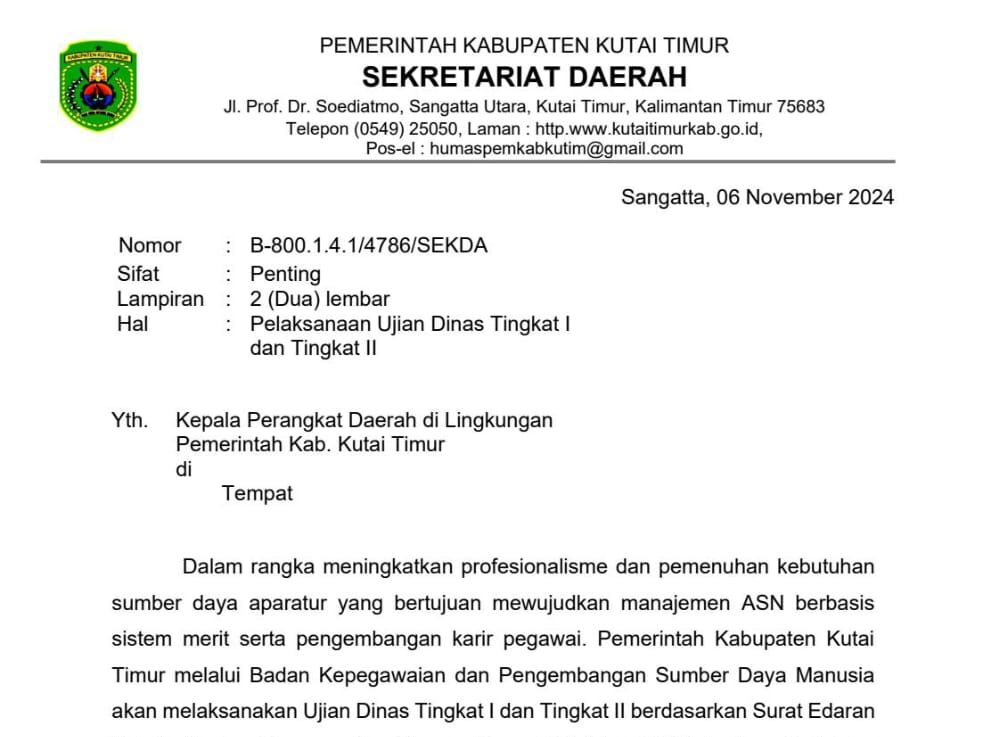 SANGATTA – Pemerintah Kabupaten Kutai Timur (Pemkab Kutim) akan melaksanakan Ujian Dinas Tingkat I dan II pada akhir November 2024, sebagai langkah untuk meningkatkan profesionalisme Aparatur Sipil Negara (ASN) di lingkup Pemkab. Kegiatan ini sejalan dengan kebijakan merit yang diterapkan Pemerintah Pusat, yang mengutamakan promosi ASN berdasarkan kompetensi dan kinerja.